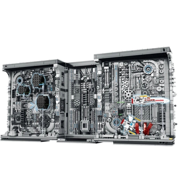 Auf den ersten Blick erscheint das Set wie ein stilvolles Hardcover-Buch mit edler Prägung. Doch öffnet man die Buchseiten, entfaltet sich ein faszinierendes Diorama: Mit einem Mini-Sternenzerstörer, ikonischen Raumschiffen und einem Ausblick auf das Weltall entsteht ein einzigartiges Szenenbild aus der weit, weit entfernten Galaxis.