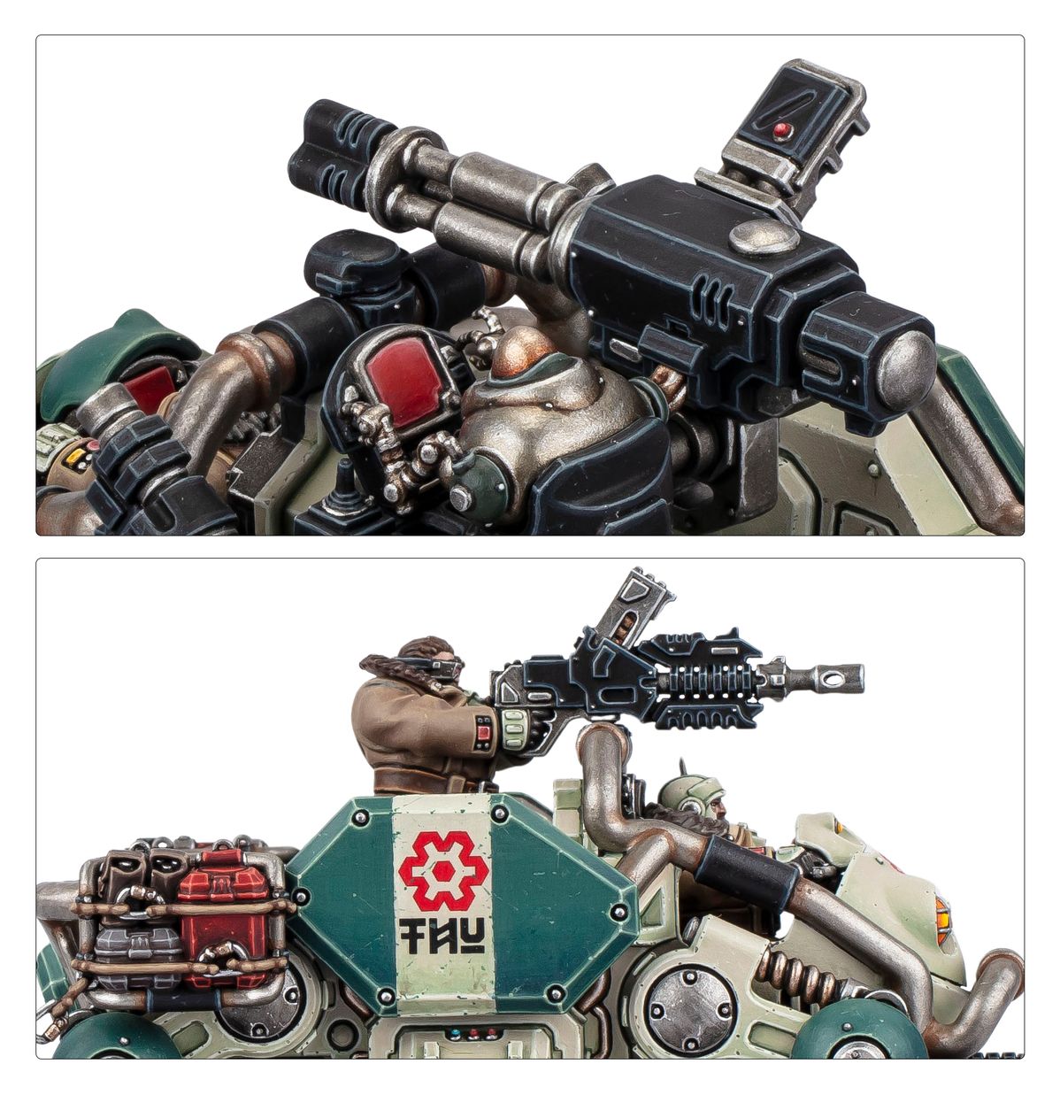 Der Bausatz enthält mehrere Turmoptionen, darunter eine Magna-Rail-Kanone, eine HYLas-Rotationskanone und zwei Magna-Coil-Autokanonen, die es ermöglichen, den Kapricus flexibel an die eigenen taktischen Bedürfnisse anzupassen. Zusätzlich sind sechs austauschbare Köpfe enthalten, darunter zwei Ironkin, um die Individualität der Besatzung zu betonen. Ein Leagues of Votann-Transfersheet mit 555 Decals ermöglicht eine detaillierte Gestaltung und Personalisierung des Modells.
